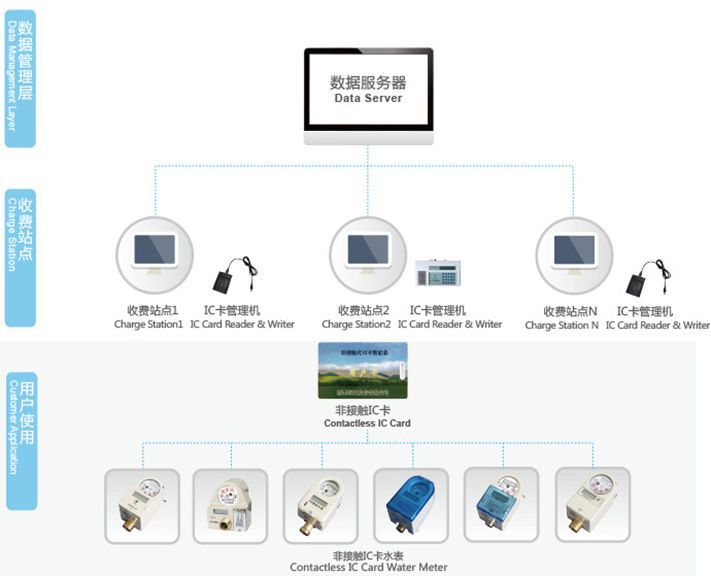 The management department writes the user's fees into the IC card, and the water meter which brushes the data automatically supplies water and calculates the remaining amount. When the water quantity is used up, the valve closes and the water stops, and the water can be used only after the water is purchased again.
